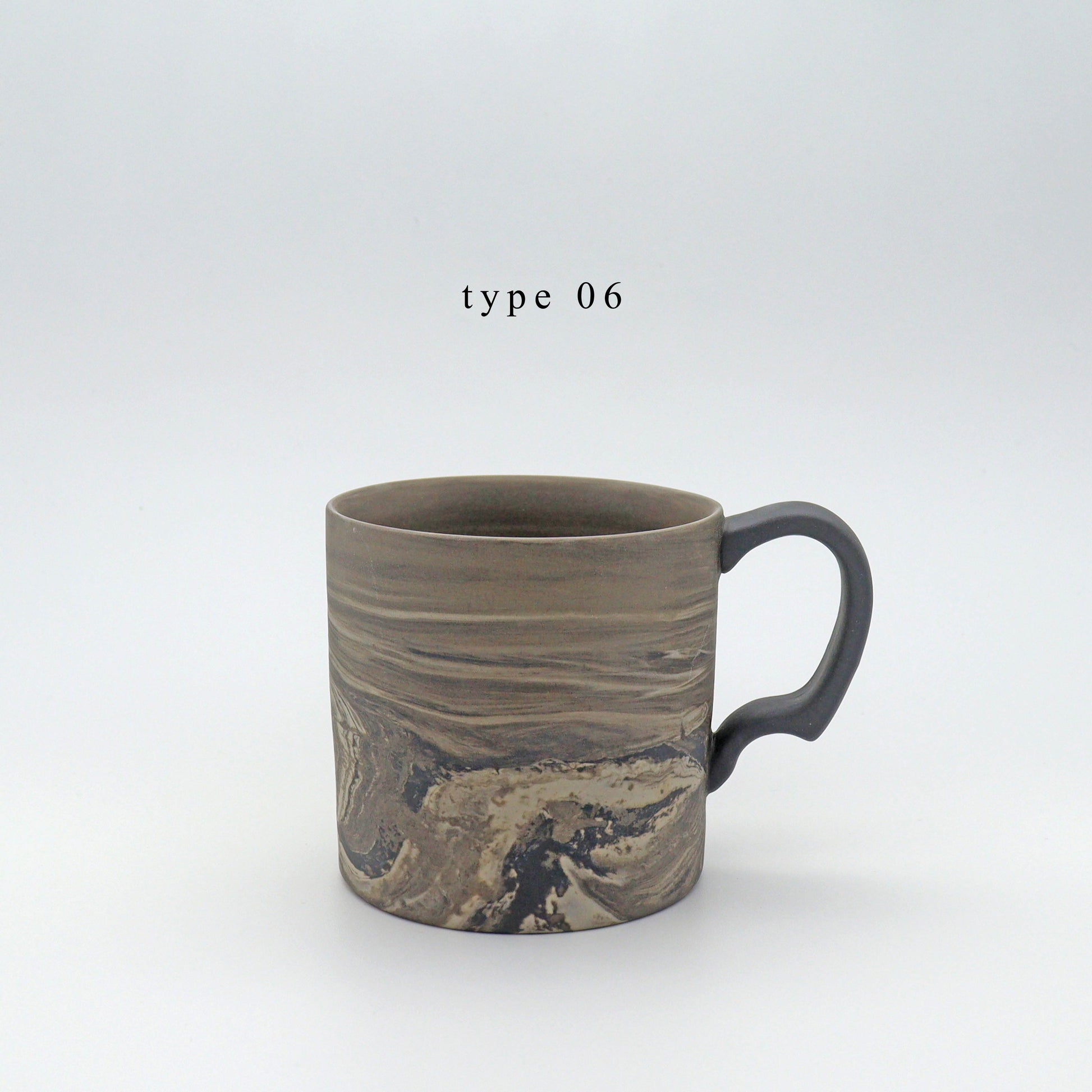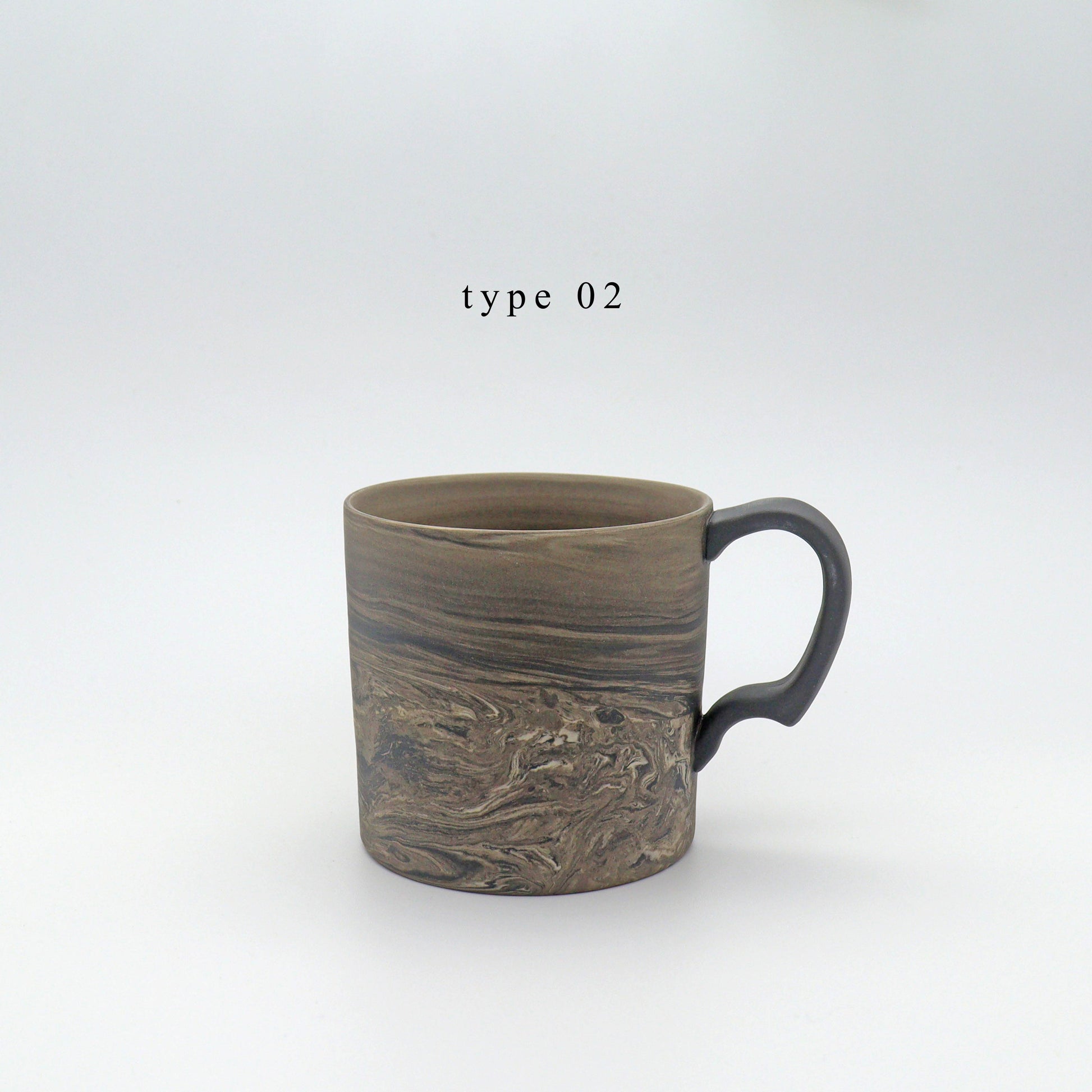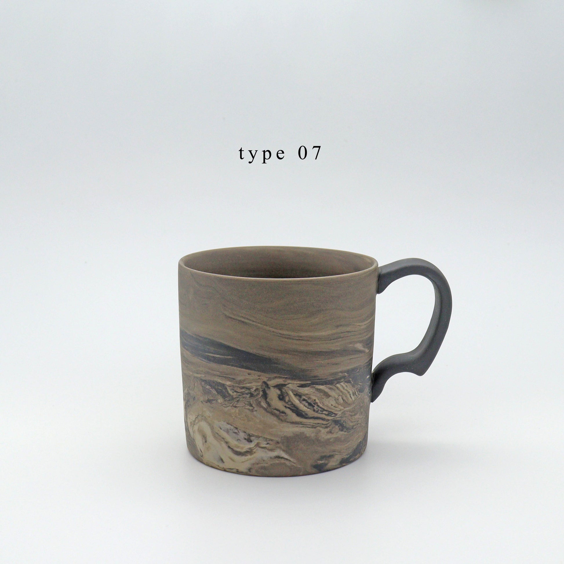 筒状のカップに柔らかなカーブを描き持ち手がついた、すっきりとしたフォルムのコーヒーカップ。