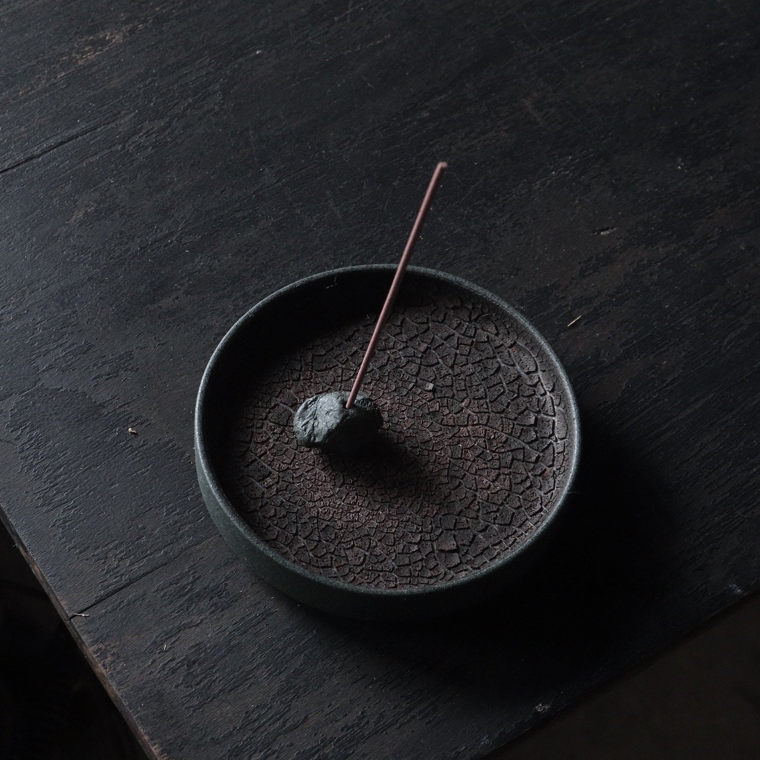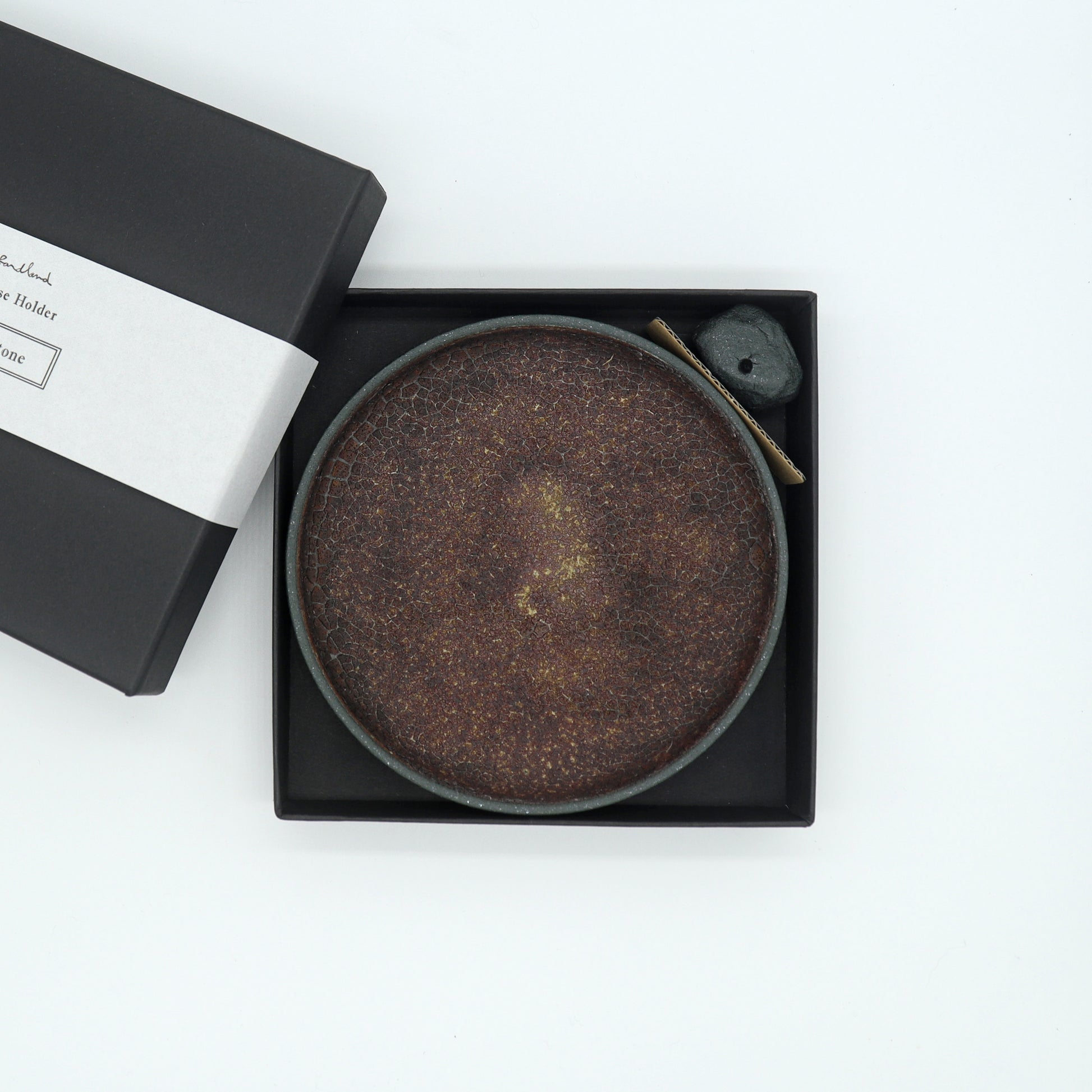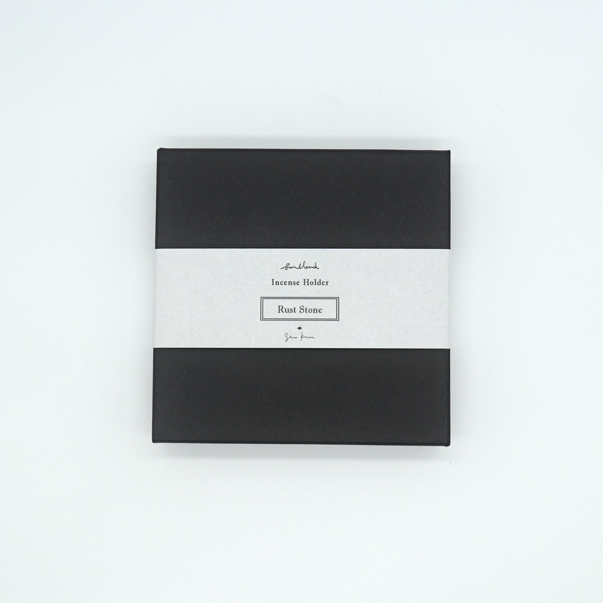 移ろいゆく自然の理りを、錆びという表情であらわし、悠久の時を香たての小石に見立て、その相対する時の表現をひとつの箱に入れたお香たてのセットです。