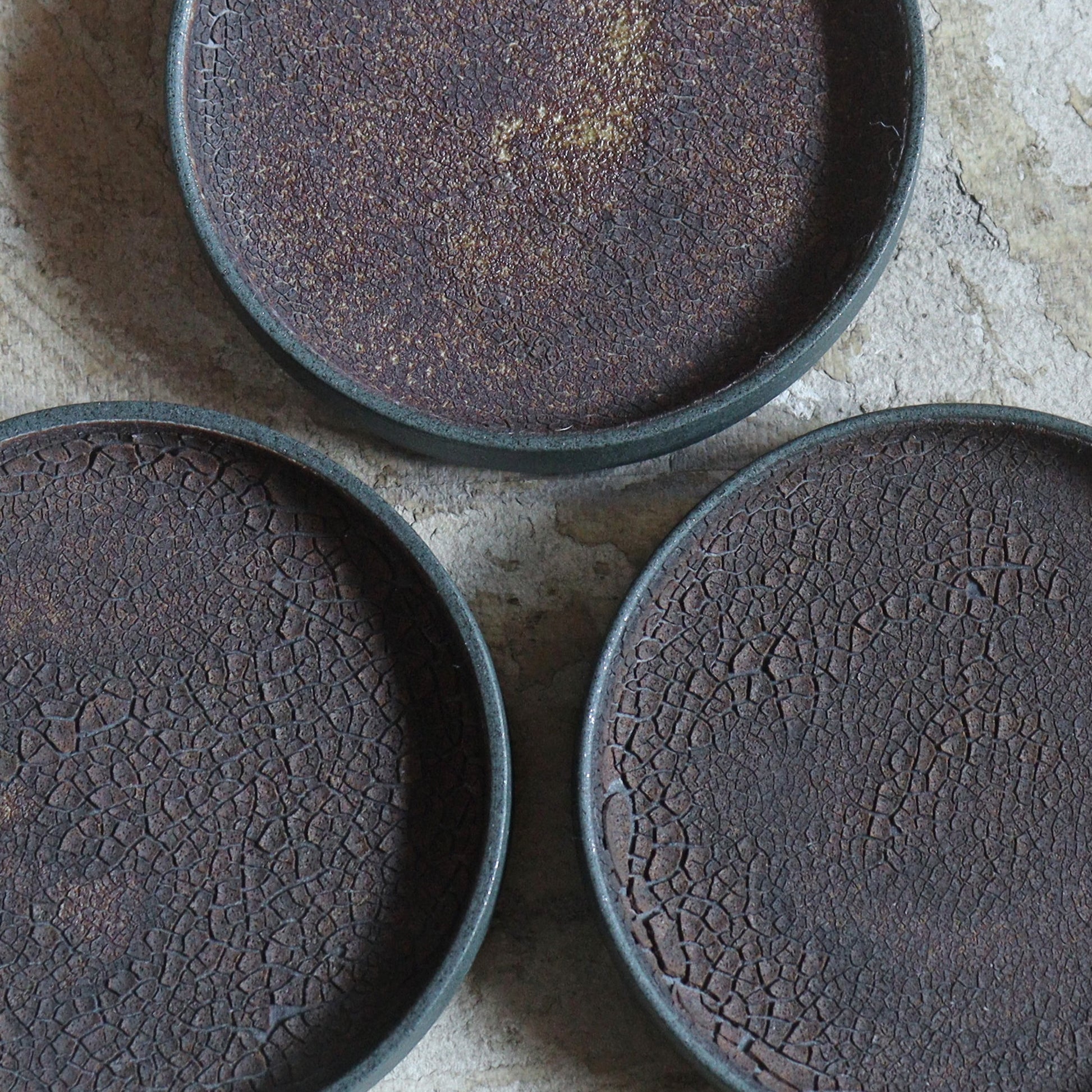 お皿の表面は、錆の表情を陶器で作り出したものです。
